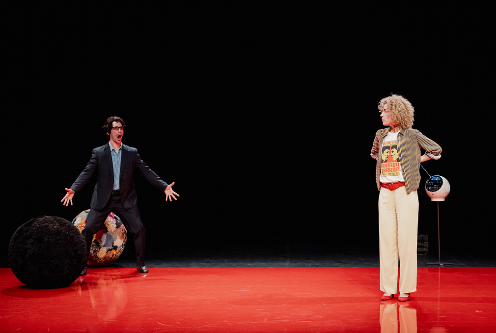 Après J.C., qui questionnait notre rapport à l’argent, et Céline, notre refus de la mort, Juliette Navis signe avec Pedro le troisième volet d’une trilogie consacrée à la culture pop. Cette fois, la metteuse en scène croise l’outrance kitsch et acidulée des films de Pedro Almodóvar avec l’imaginaire foisonnant des livres d’Ursula K. Le Guin, papesse américaine de la science-fiction. Laure Mathis et Douglas Grauwels, interprètes des deux solos précédents, prêtent vie, avec verve, poésie et un savoureux accent espagnol, à deux personnages qui nous mettent face aux paradoxes du plaisir, de la sexualité et de l’intimité dans un monde qui nous pousse à nous exposer pour exister. Une quête d’équilibre fragile : celui de la juste distance entre soi et l’autre.